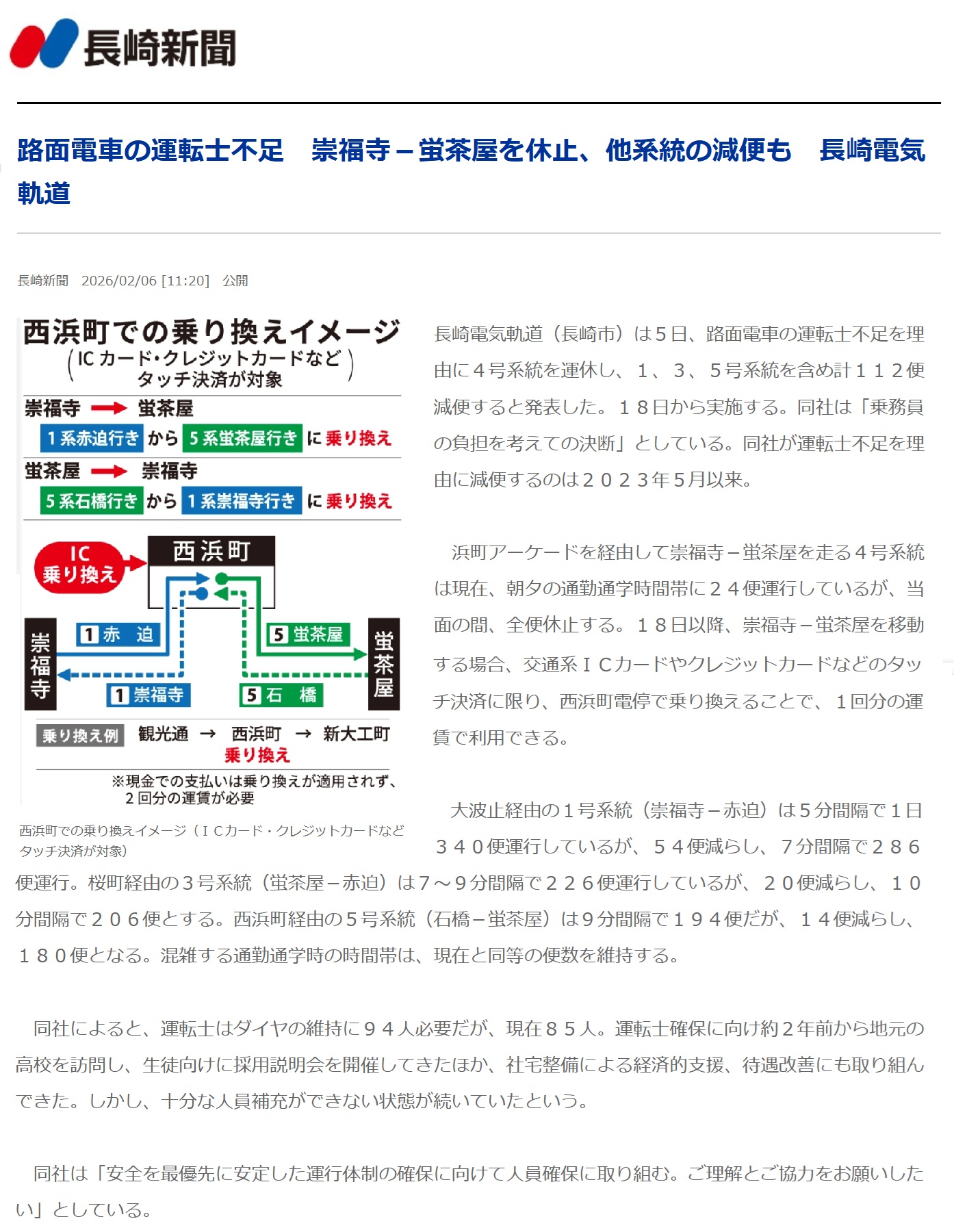 3) 長崎電気軌、運転士不足で一部路線の休止及び減便に これまで長崎Now!で長崎県下のバス運転手の人員不足を紹介してきましたが、人手不足は路面電車(長崎電気軌道)にも表れててきました。 2月18日から崇福寺ー蛍茶屋の運休や他系統で減便が行われることになりました。 崇福寺ー蛍茶屋間の移動は、西浜町でタッチ決済を使って乗り換えた時のみ、1回分の運賃で利用できるようになっていることも含め、長崎を訪れる方はご注意下さい。