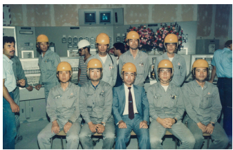 浦上副所長来所、中央制御室にて(1985年撮影) 浦上副所長の向かって右が筆者石瀬 |